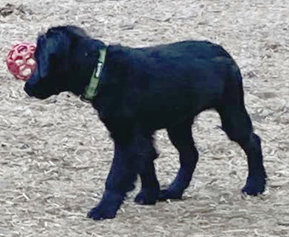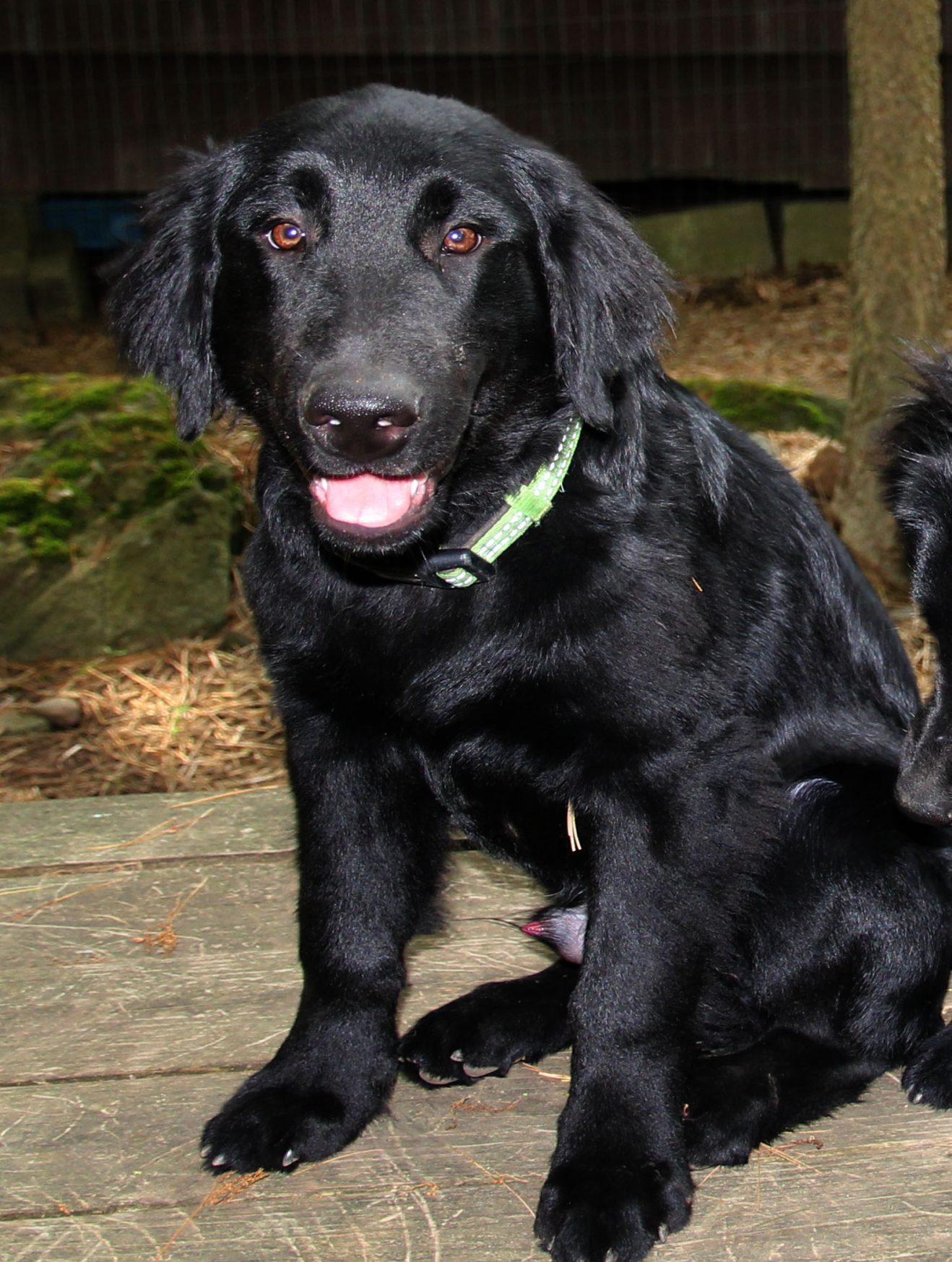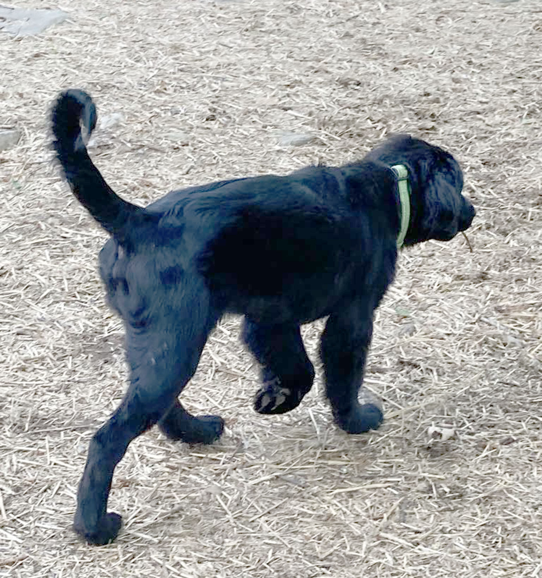 Green Jeans weighed 42.2 lbs. on June 13, 2024, he is a male flat coat retriever and was the first born. He is very loving and a laid-back big boy; each day before he is put down for a nap, he is the first to snuggle right up to his human and put his right paw on her leg. He is very smart, loving and social with people and dogs. He loves the pool but just but cautious about what exactly water is all about, personal attention and companionship from his littermates and humans.